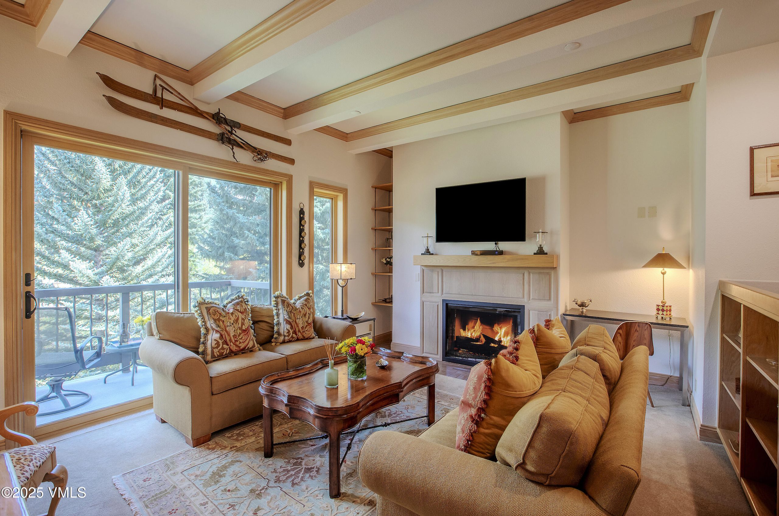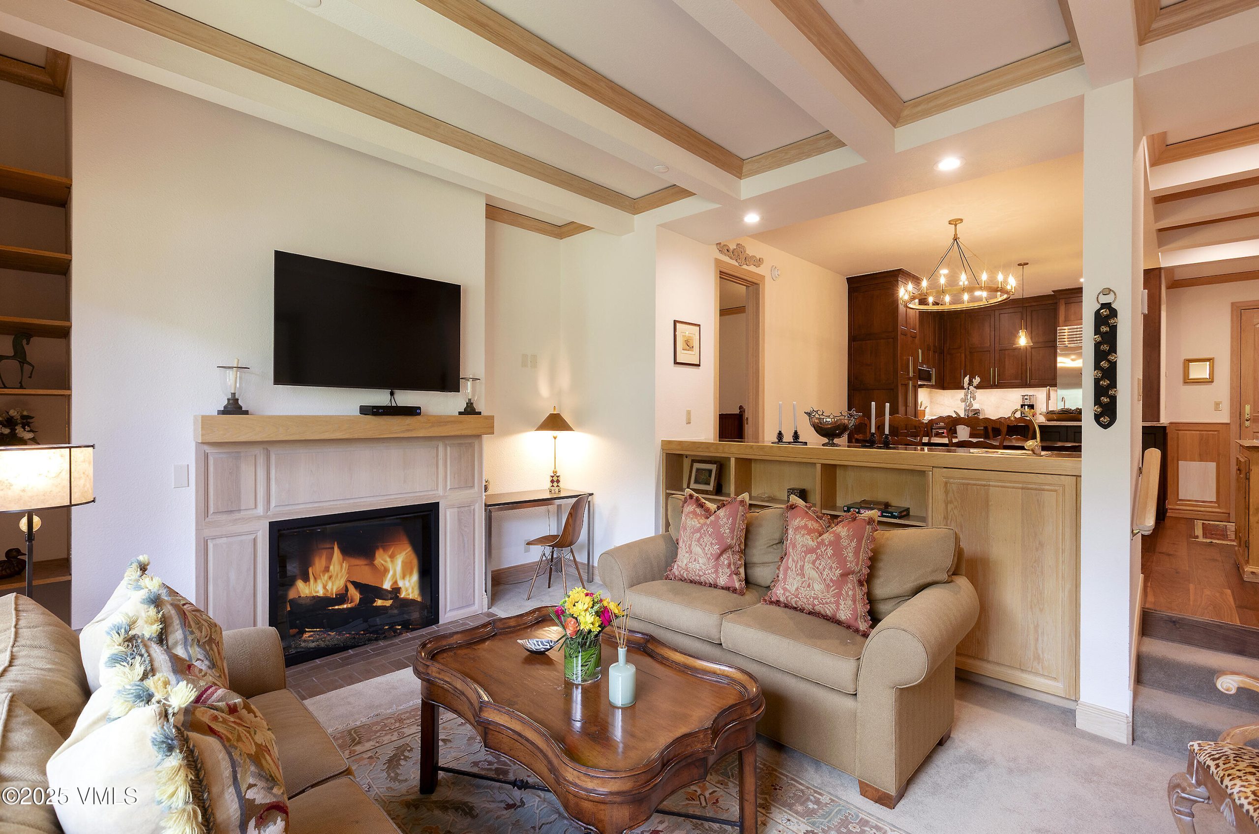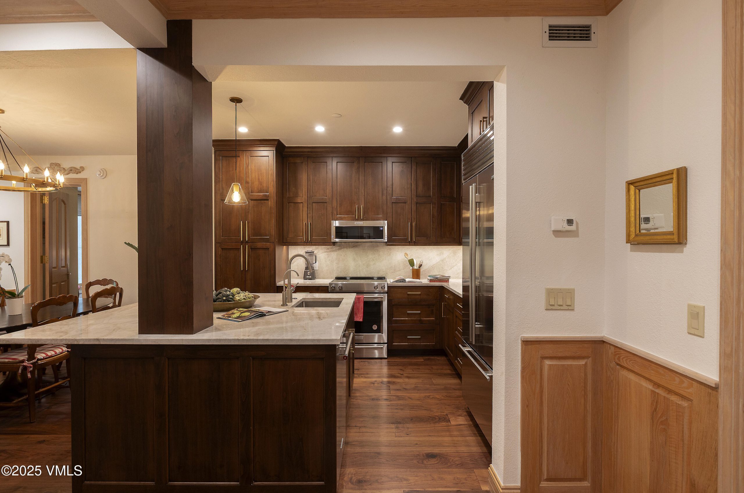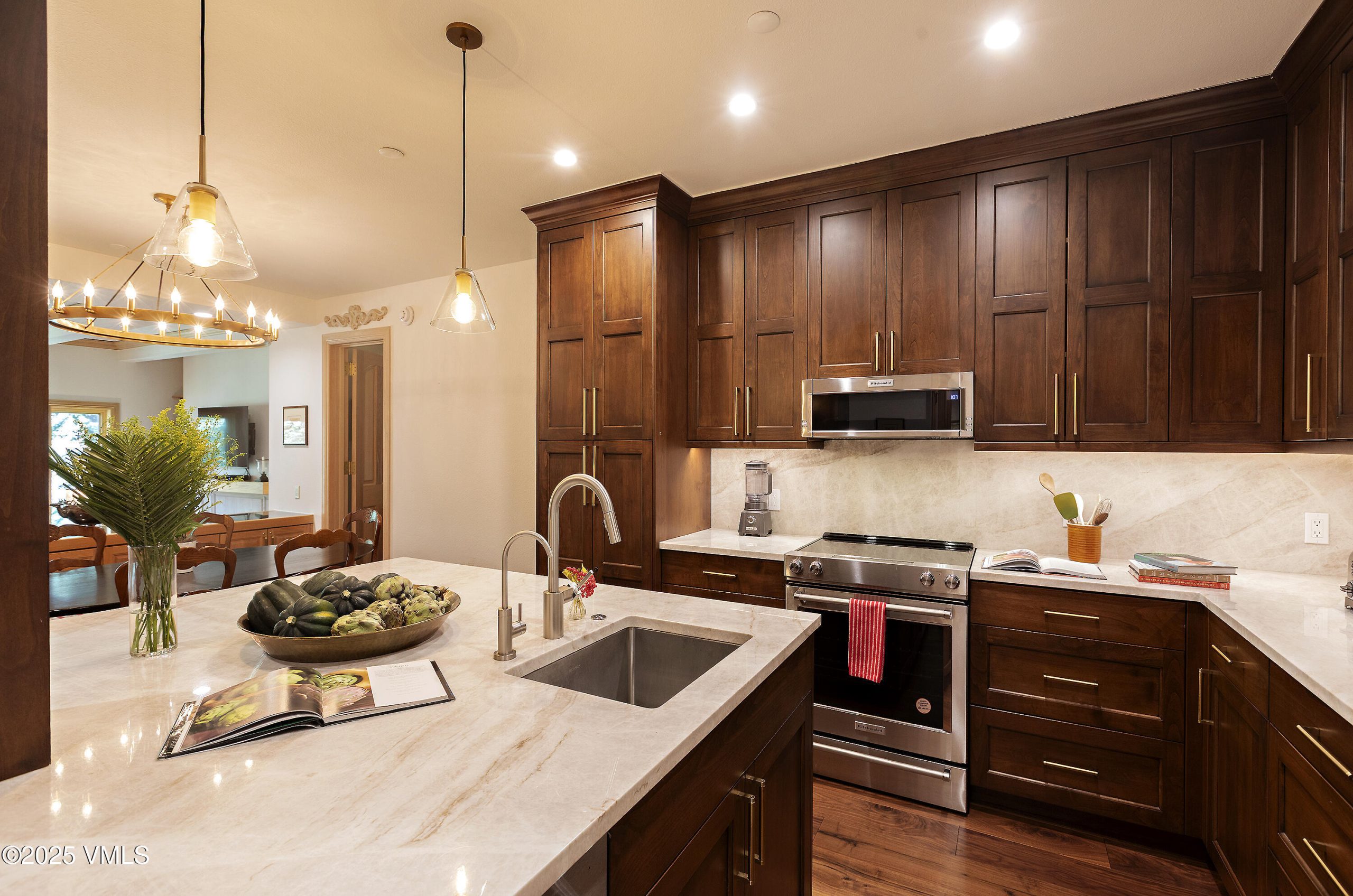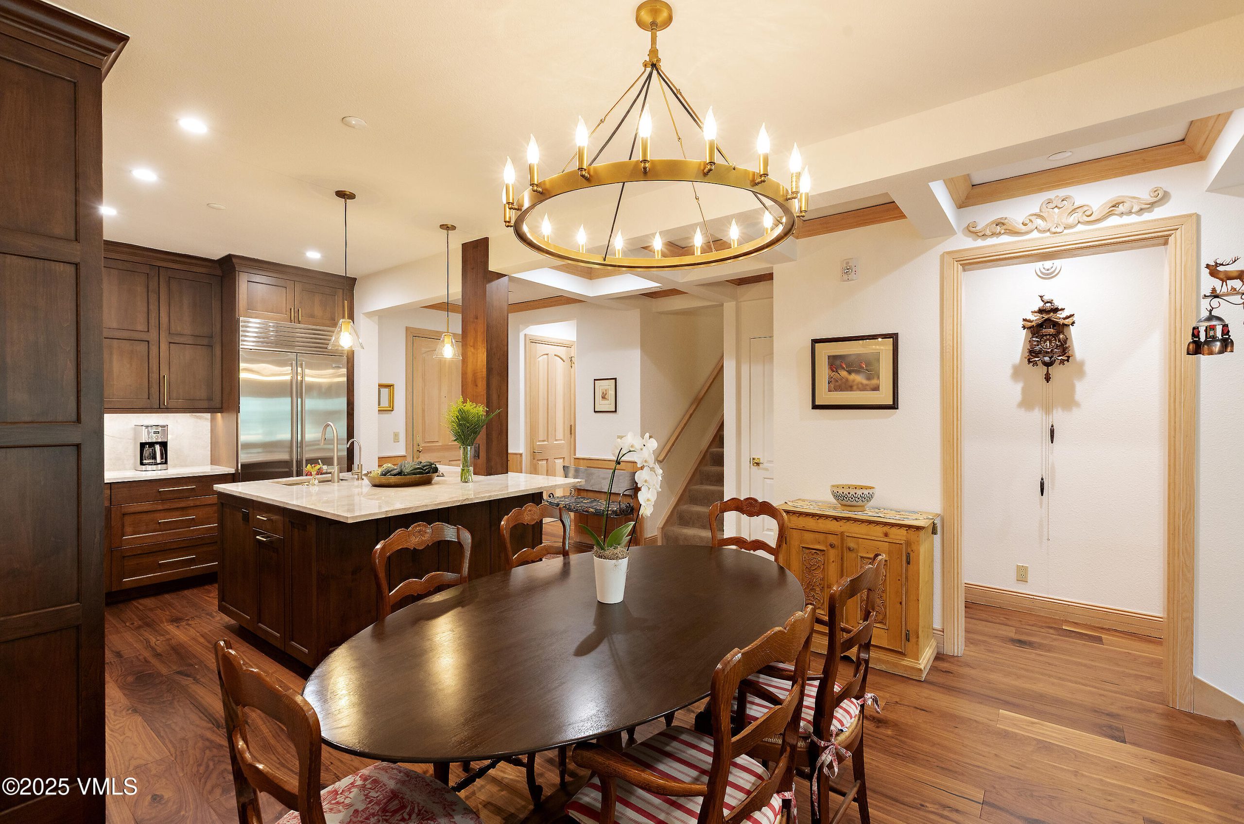 The home opens with a handsome chef's kitchen — a true ''Heart of the Home''— showcasing rich hardwood floors, an expansive marble-topped island, floor-to-ceiling cabinetry, and premium stainless-steel appliances. Beyond lies a gracious dining area with a wet bar, ideal for gathering with family and friends. Step down into the inviting great room, where a cozy electric fireplace, custom built-ins, and generous seating frame the serene alpine views. From the deck, listen to Beaver Creek's gentle babble while overlooking lushly landscaped grounds, Creekside Park, and the surrounding mountain panorama.