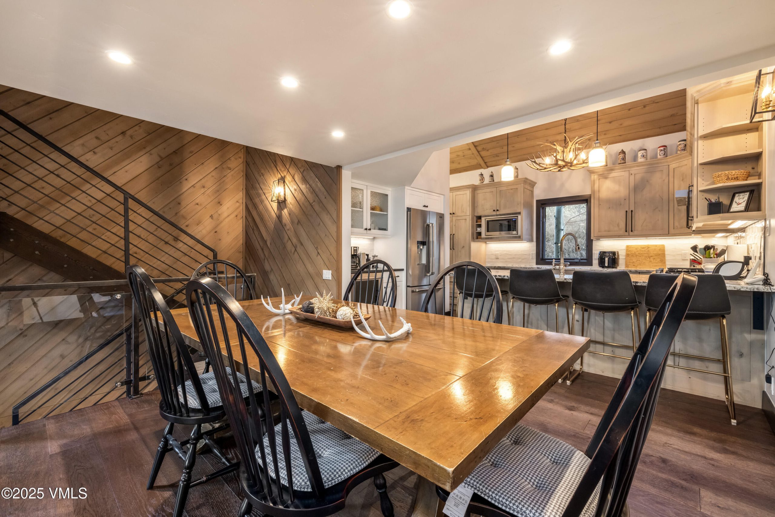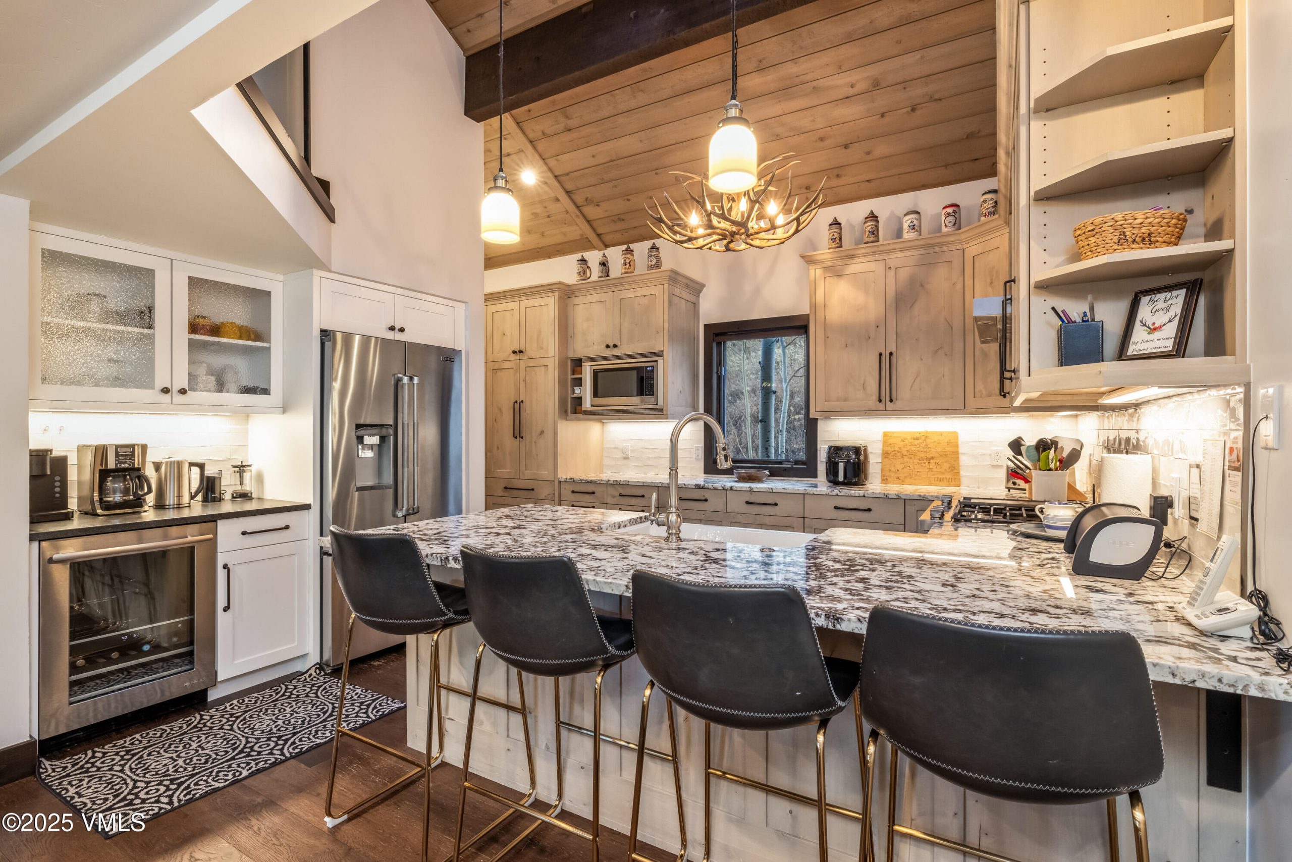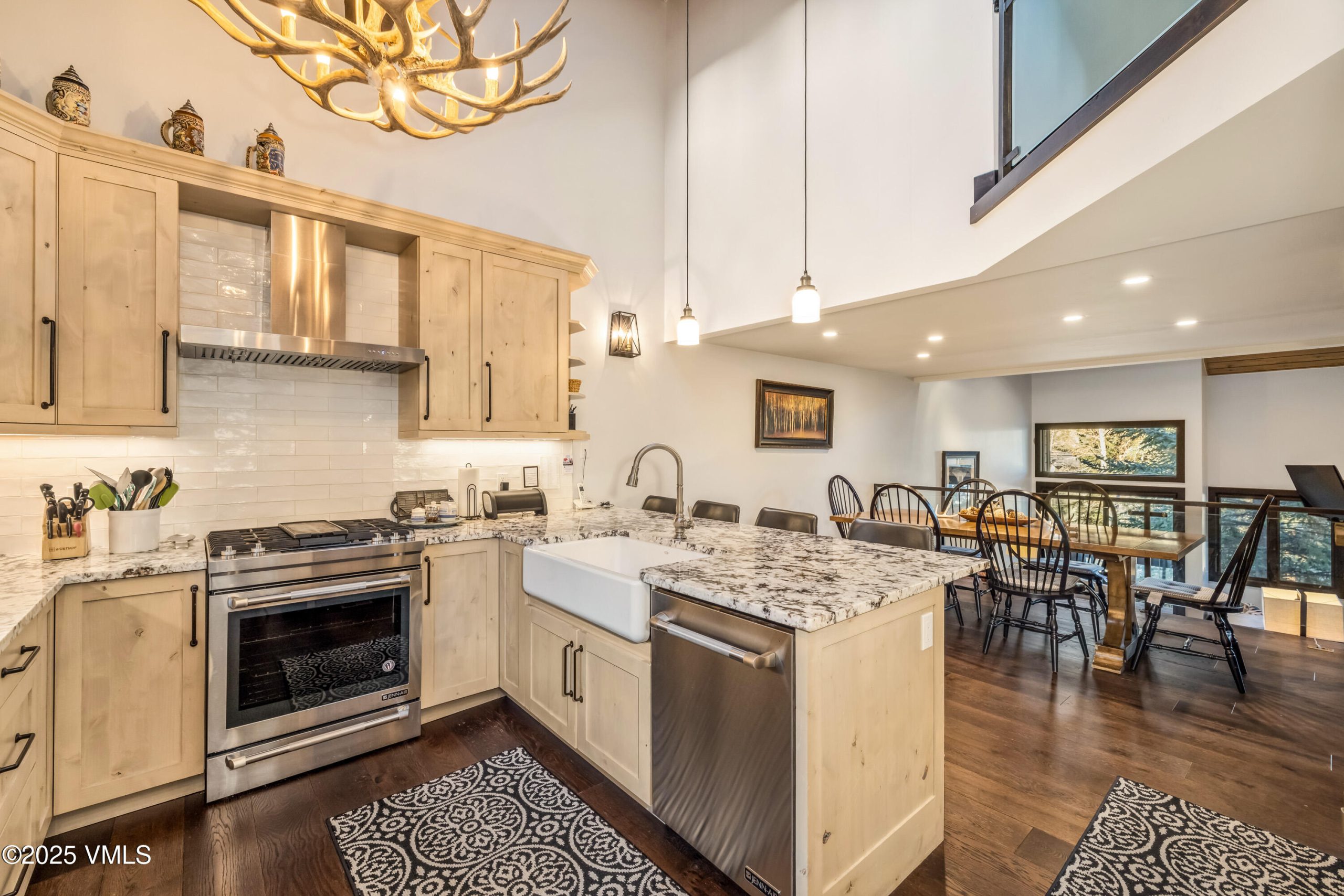 The open-concept main level features vaulted ceilings, a stone fireplace, and expansive windows that fill the home with natural light and mountain views. The kitchen boasts quartz countertops, stainless steel appliances, and a generous breakfast bar—ideal for gathering after a day on the slopes. New kitchen, baths and flooring completed in 2020.
