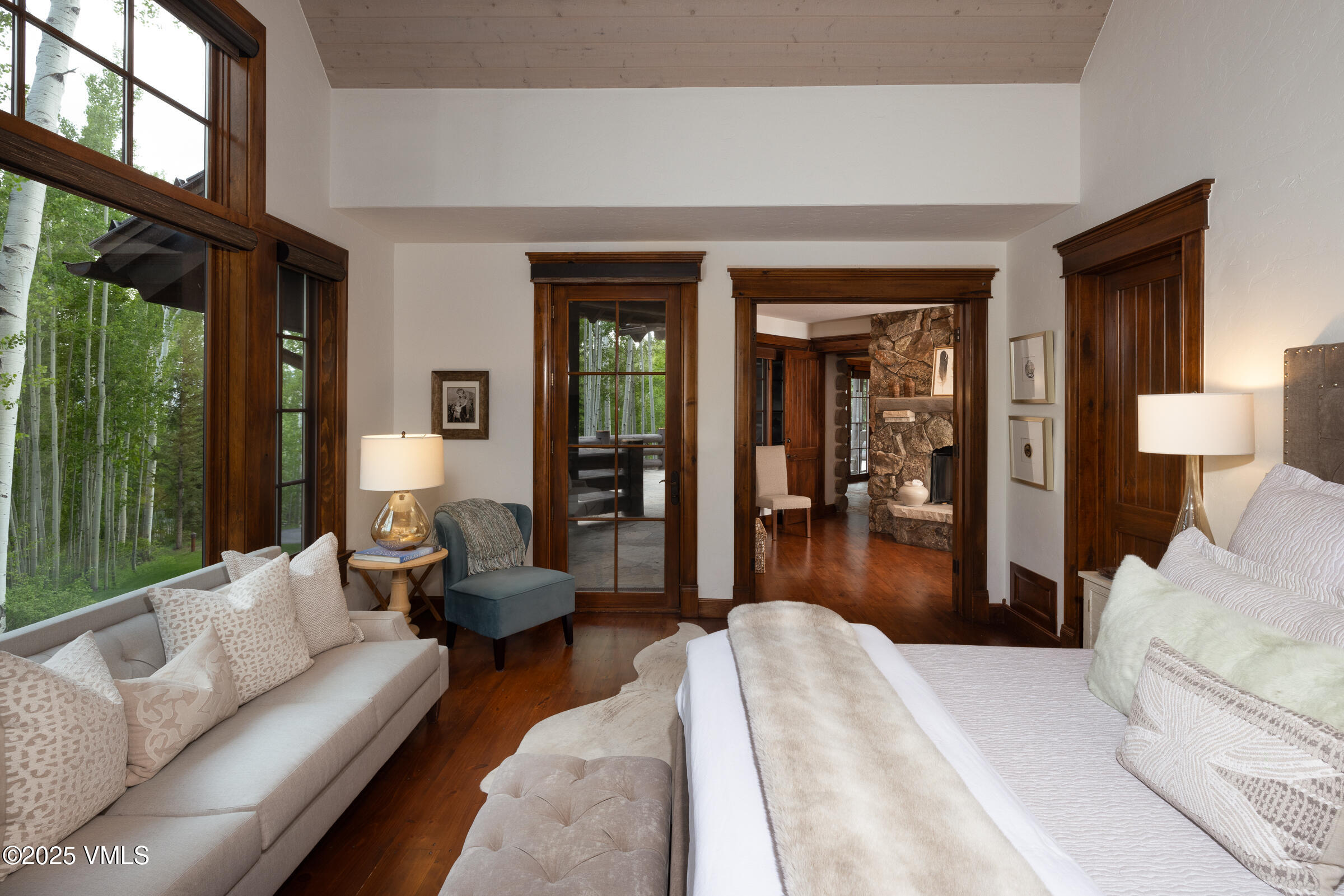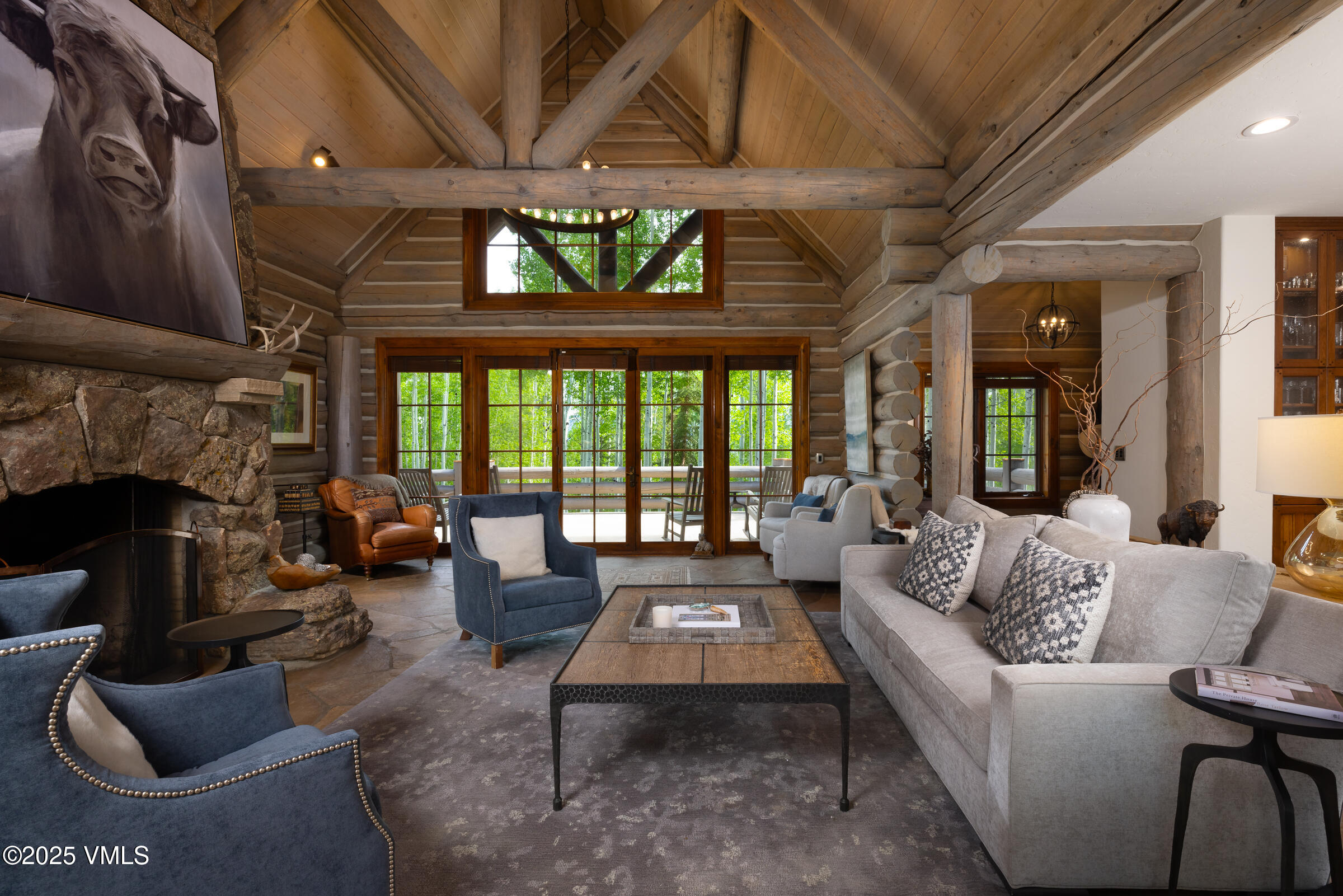 This beautifully appointed single-family home in the exclusive gated community of Mountain Star is truly a mountain retreat. Nestled in a private setting, directly adjacent to the USFS, this log home features stunning landscaping complete with a double water feature, creating a serene and inviting atmosphere. The interior welcomes you with an expansive open floor plan, filtered mountain views, and rustic elements like vaulted ceilings with log beams and a stone wood burning fireplace. The cozy dining room area is perfect for intimate meals, while the adjacent kitchen is a chef's dream, equipped with a Viking professional stove, granite countertops, an island for prepping meals, bar seating for entertaining, a charming breakfast nook, all set on beautiful hardwood flooring. The space opens to a deck surrounded by aspens, featuring outdoor furniture, a gas grill, and a built-in TV. The main level includes a private office with a fireplace, leading to the primary bedroom with deck access, a walk-in closet, and a luxurious bath with a soaking tub and steam shower. Upstairs, two large bedrooms with ensuite bathrooms offer comfort; one with custom bunk beds and bookshelves, the other with a daybed and spacious bath. The lower-level of the home is designed for entertainment; it includes a large family room with a natural stone gas fireplace, wine closet, pool table, and a built-in kitchenette with custom cabinetry and shelving. This level provides direct access to the grassy yard and patio from the fitness/gym room where a large hot tub and an outdoor gas fireplace create a tranquil retreat amidst the woods. Additionally, the lower-level houses two guest bedrooms that share a full bathroom. The home also features a two-car garage with custom storage and a partially heated driveway for added convenience; DaVinci roof. This beautiful residence, minutes from the main resorts, is being sold furnished.
